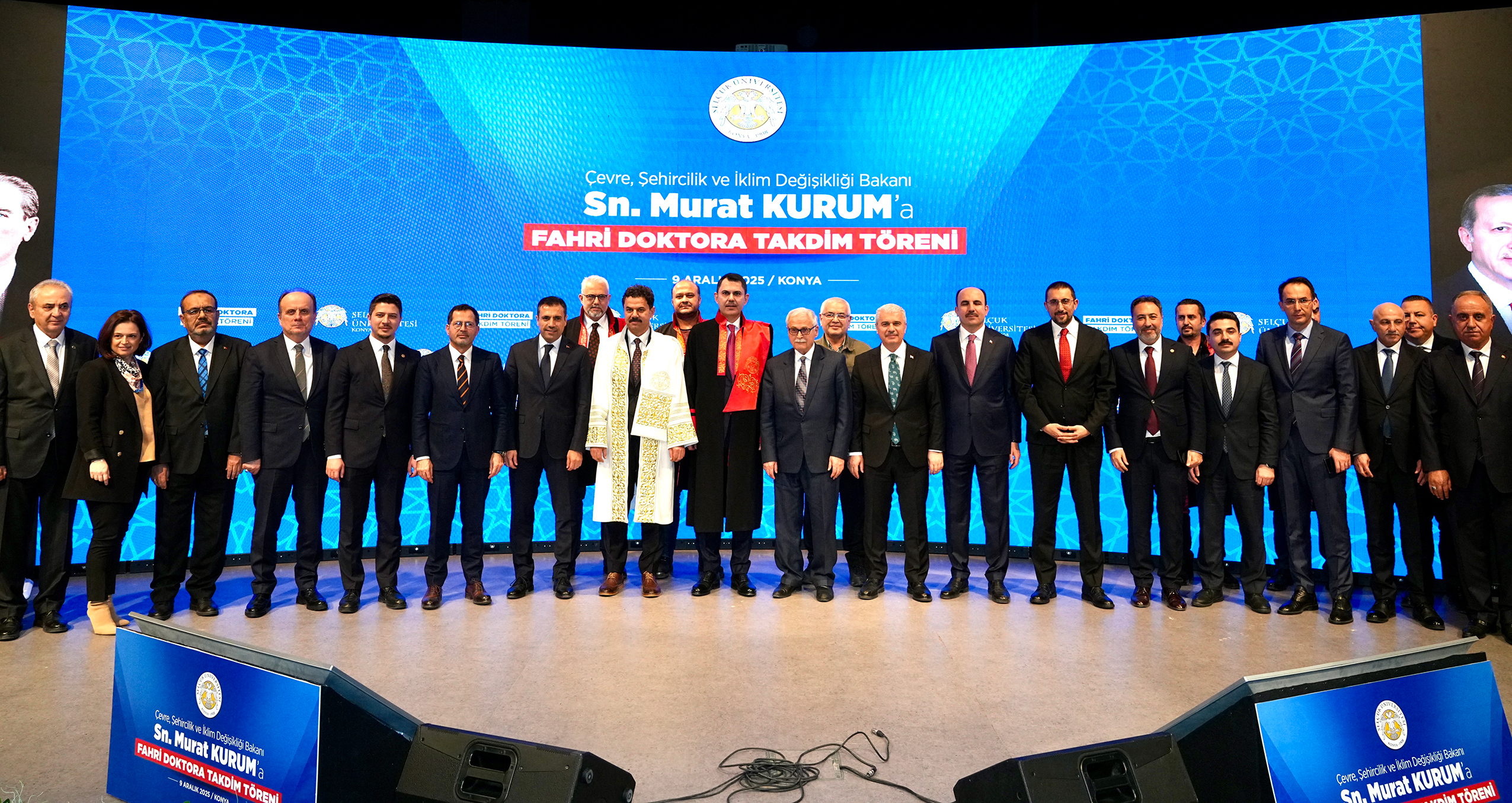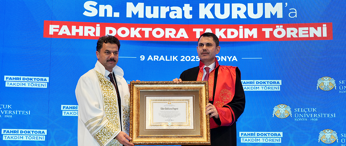 Çevre, Şehircilik ve İklim Değişikliği Bakanı Murat Kurum, Konya programı kapsamında Suriçi Çarşısı 1. Etap Açılış Töreni’nin ardından Selçuk Üniversitesi’nde düzenlenen fahri doktora takdim törenine katıldı. Törende konuşan Bakan Kurum, “Asırlardır alim ile devlet adamı arasındaki köklü bağ bu topraklarda serpilmiş, gelişmiş ve bir kültür haline gelmiştir. Bu bakımdan Konya hem devleti hem ilmi hem devlet adamını hem de alimi temsil eden bir medeniyet merkezidir. Üniversite yıllarımda ve sonrasında üstlendiğim her görevde, bu şehrin tecrübesi ve bu okulun kazandırdığı bilinç daima yol göstericim olmuştur. Bu nedenle, Üniversitemizin takdir ettiği bu fahri doktora ünvanını, her zaman gururla, onurla, şerefle taşıyacağım” dedi.