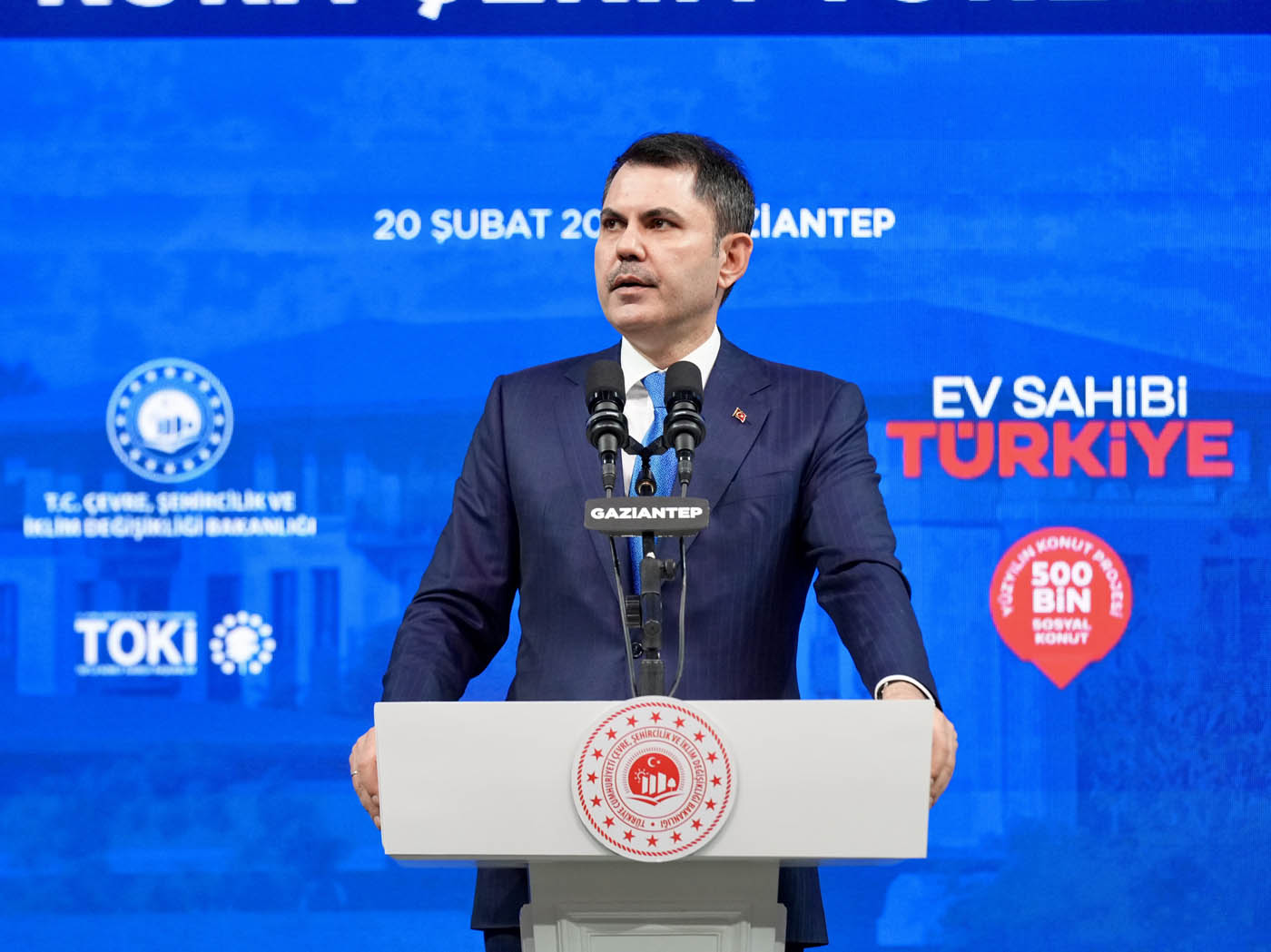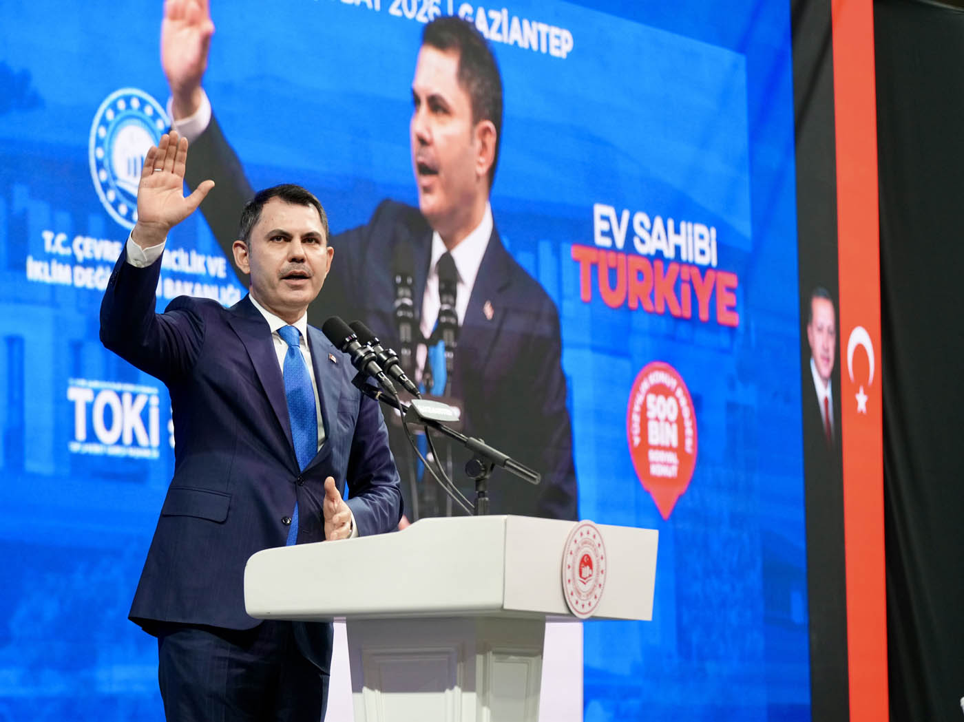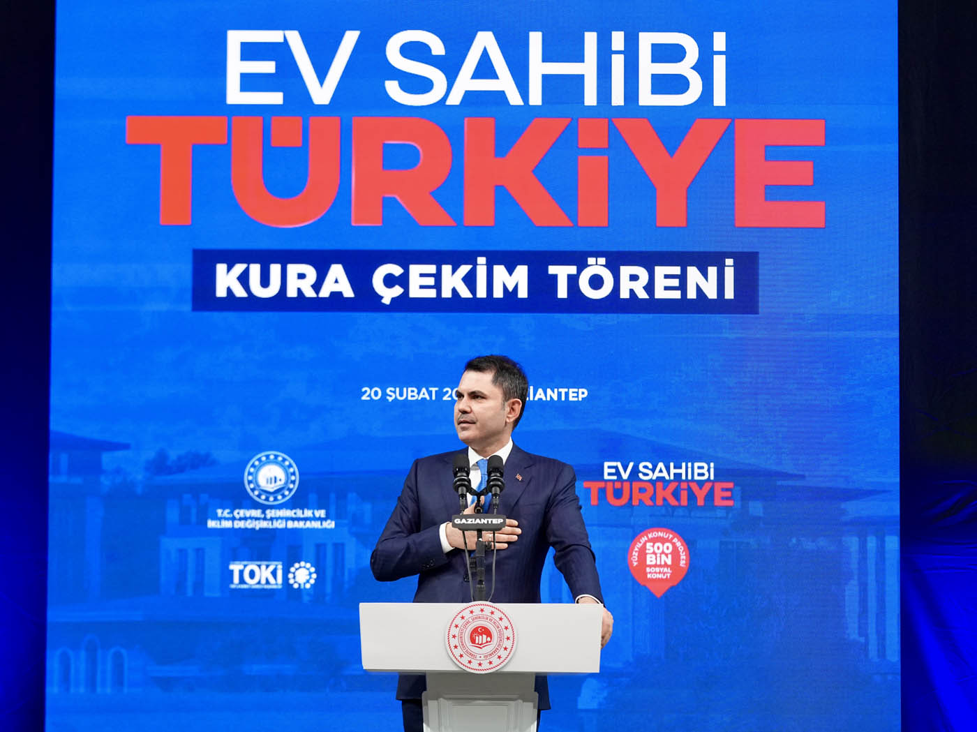 Çevre, Şehircilik ve İklim Değişikliği Bakanı Murat Kurum, Gaziantep'te "Ev Sahibi Türkiye" kura çekim törenine katıldı. Törende 13 bin 890 konutun hak sahipleri noter huzurunda çekilen kura ile belirlendi. Konuşmasında Asrın Felaketi sırasında ilk olarak Gaziantep’e geldiklerini belirten Bakan Kurum, 46. günde ilk afet konutlarının temelinin Nurdağı’nda atıldığını hatırlattı. Asrın İnşa Seferberliği kapsamında Gaziantep’te 31 bin bağımsız bölümün yeniden inşa edildiğini vurgulayan Bakan Kurum, “Biliyoruz ki şu anda dünya üzerinde, 2 yılda 455 bin konutun zemin etütlerini yapacak, projesini çizecek, planlamasını tamamlayacak ve alnının akıyla tamamlayacak başka bir ülke yoktur. Şu anda saatte 23, günde 550 konut üretecek tecrübeye, birikime ve azme sahip; Türkiye’den başka bir ülkeden söz dahi edilemez. Avrupa’da, Amerika’da sellerde, vatandaşını sigorta şirketlerinin insafına havale eden bir anlayış varken Türkiye Cumhuriyeti, Recep Tayyip Erdoğan liderliğinde milletini hiçbir zaman darda, zorda, açıkta bırakmamıştır” dedi.