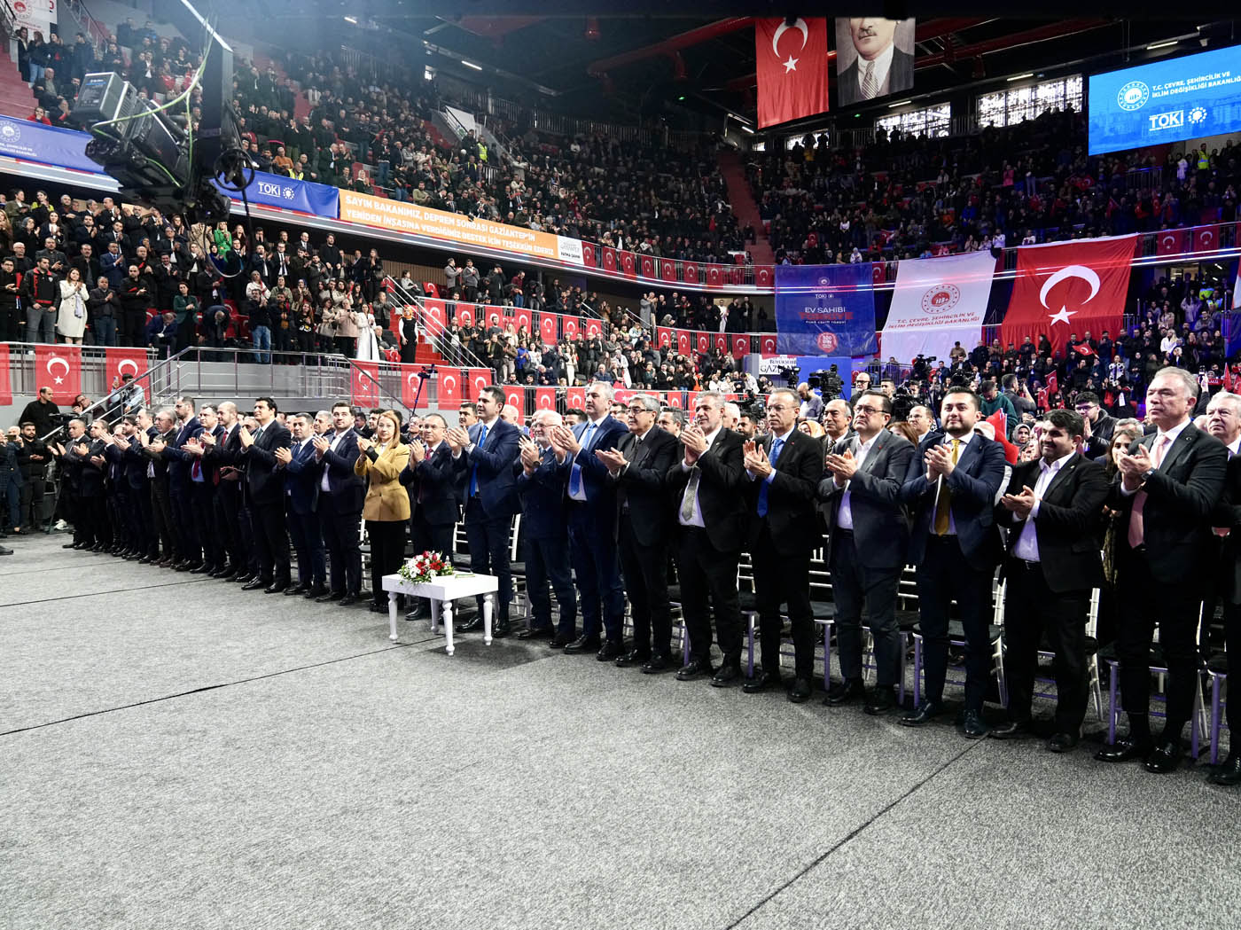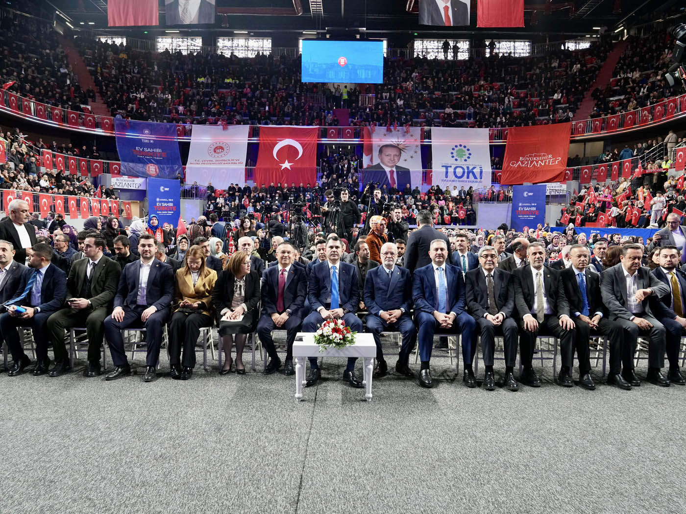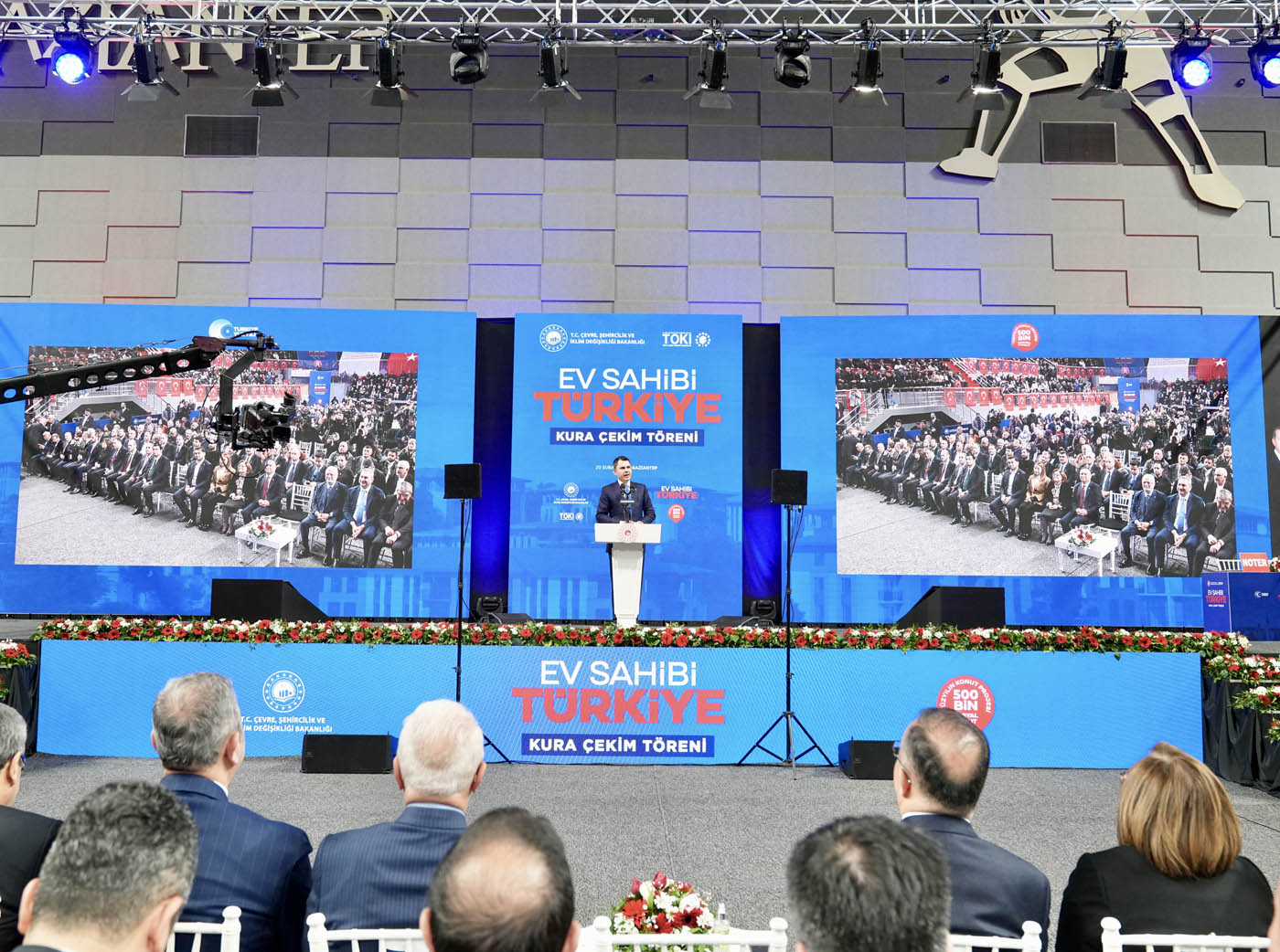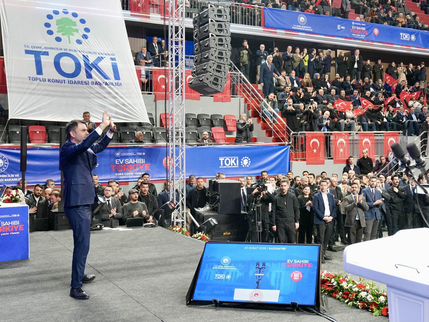 Çevre, Şehircilik ve İklim Değişikliği Bakanı Murat Kurum, Gaziantep'te "Ev Sahibi Türkiye" kura çekim törenine katıldı. Törende 13 bin 890 konutun hak sahipleri noter huzurunda çekilen kura ile belirlendi. Konuşmasında Asrın Felaketi sırasında ilk olarak Gaziantep’e geldiklerini belirten Bakan Kurum, 46. günde ilk afet konutlarının temelinin Nurdağı’nda atıldığını hatırlattı. Asrın İnşa Seferberliği kapsamında Gaziantep’te 31 bin bağımsız bölümün yeniden inşa edildiğini vurgulayan Bakan Kurum, “Biliyoruz ki şu anda dünya üzerinde, 2 yılda 455 bin konutun zemin etütlerini yapacak, projesini çizecek, planlamasını tamamlayacak ve alnının akıyla tamamlayacak başka bir ülke yoktur. Şu anda saatte 23, günde 550 konut üretecek tecrübeye, birikime ve azme sahip; Türkiye’den başka bir ülkeden söz dahi edilemez. Avrupa’da, Amerika’da sellerde, vatandaşını sigorta şirketlerinin insafına havale eden bir anlayış varken Türkiye Cumhuriyeti, Recep Tayyip Erdoğan liderliğinde milletini hiçbir zaman darda, zorda, açıkta bırakmamıştır” dedi.